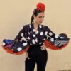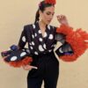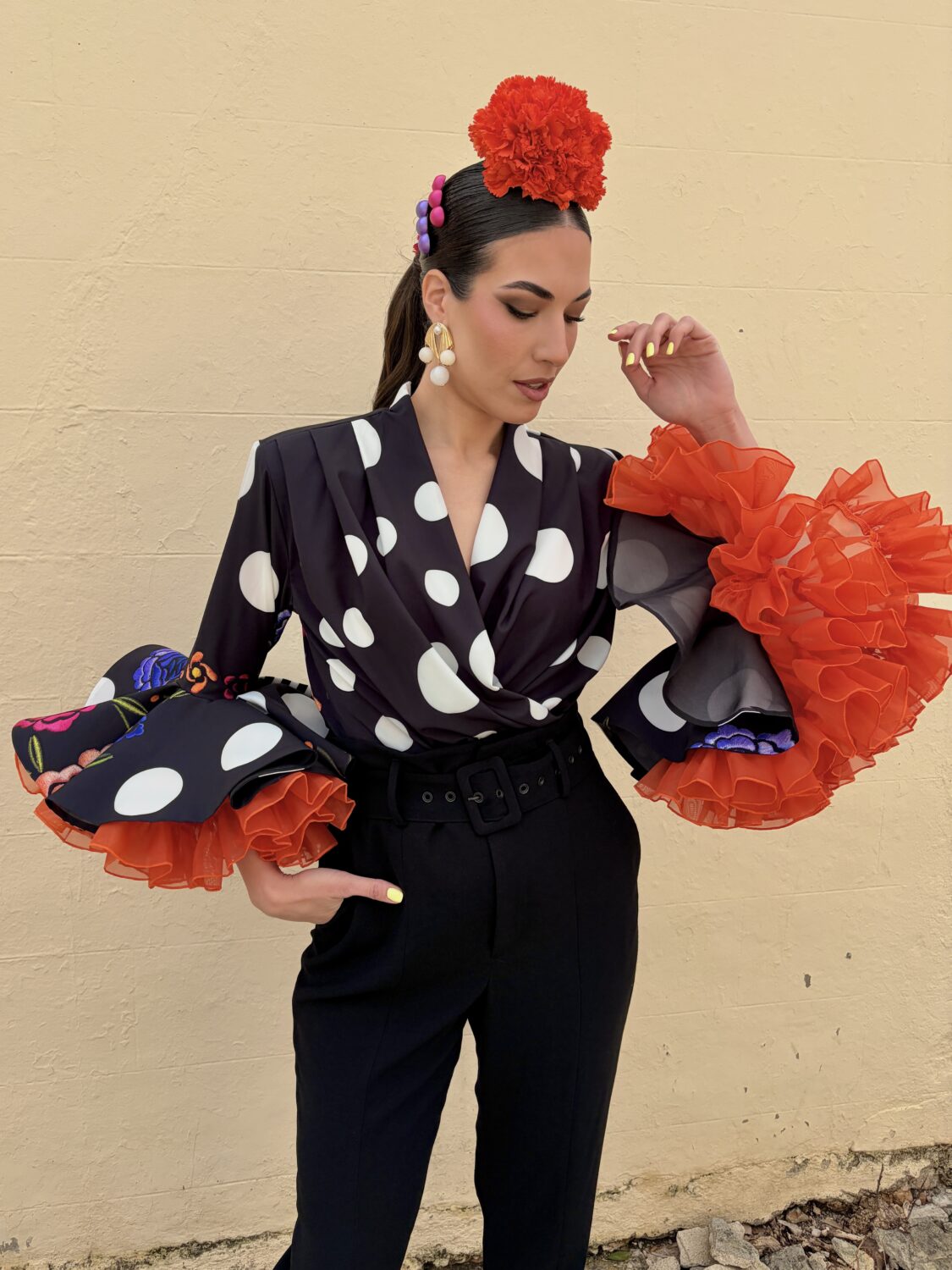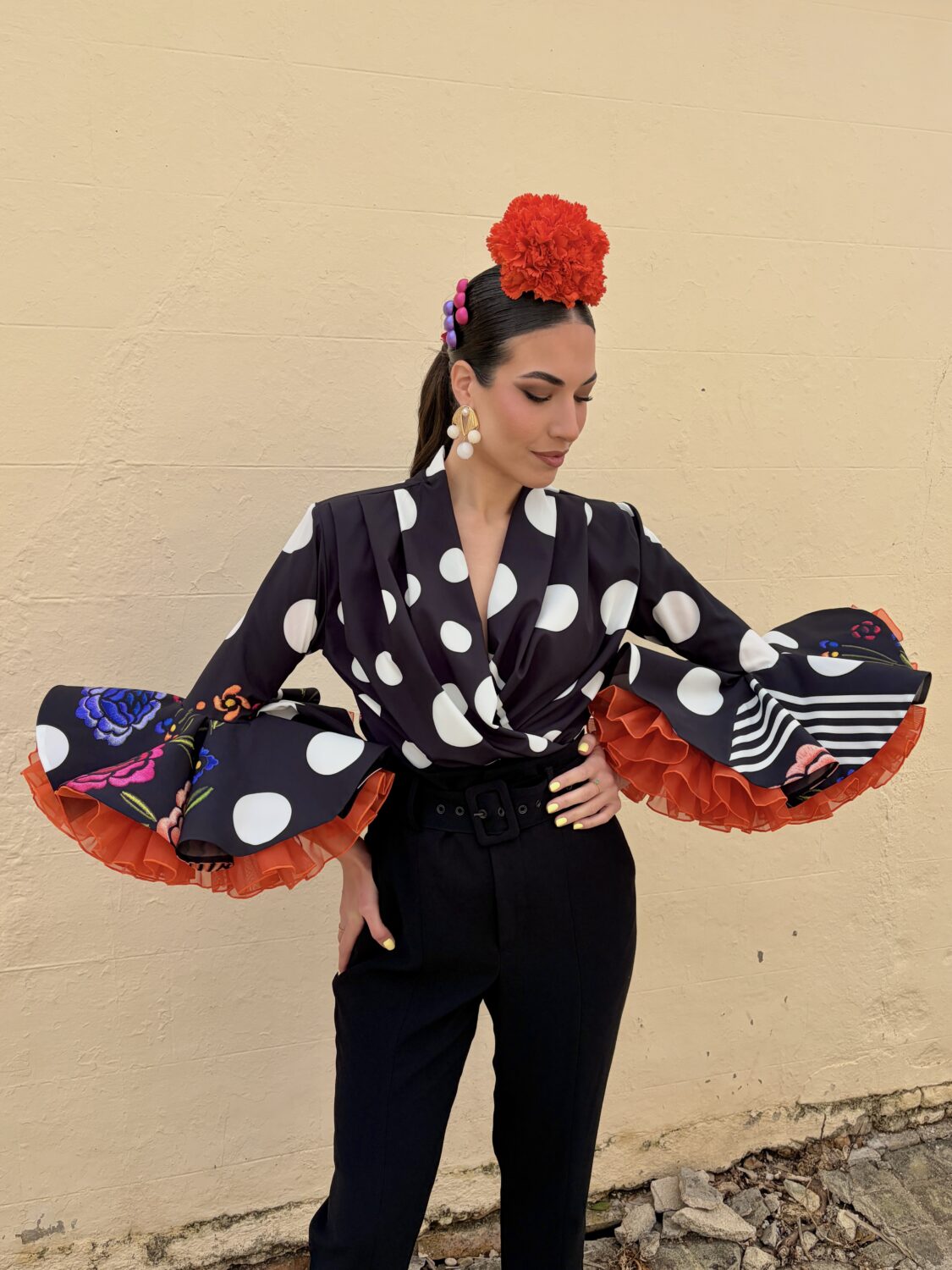 Blusa confeccionada en tejido de popelin elastico, estampado de flores de mantón en tonos malva, coral y fucsia, rayas y lunares en blanco y negro.