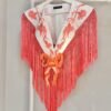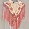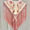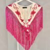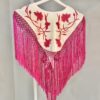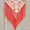Capa con forma de mantoncillo confecionada en strech con bordado de claveles, fleco de seda y enrejado a mano.