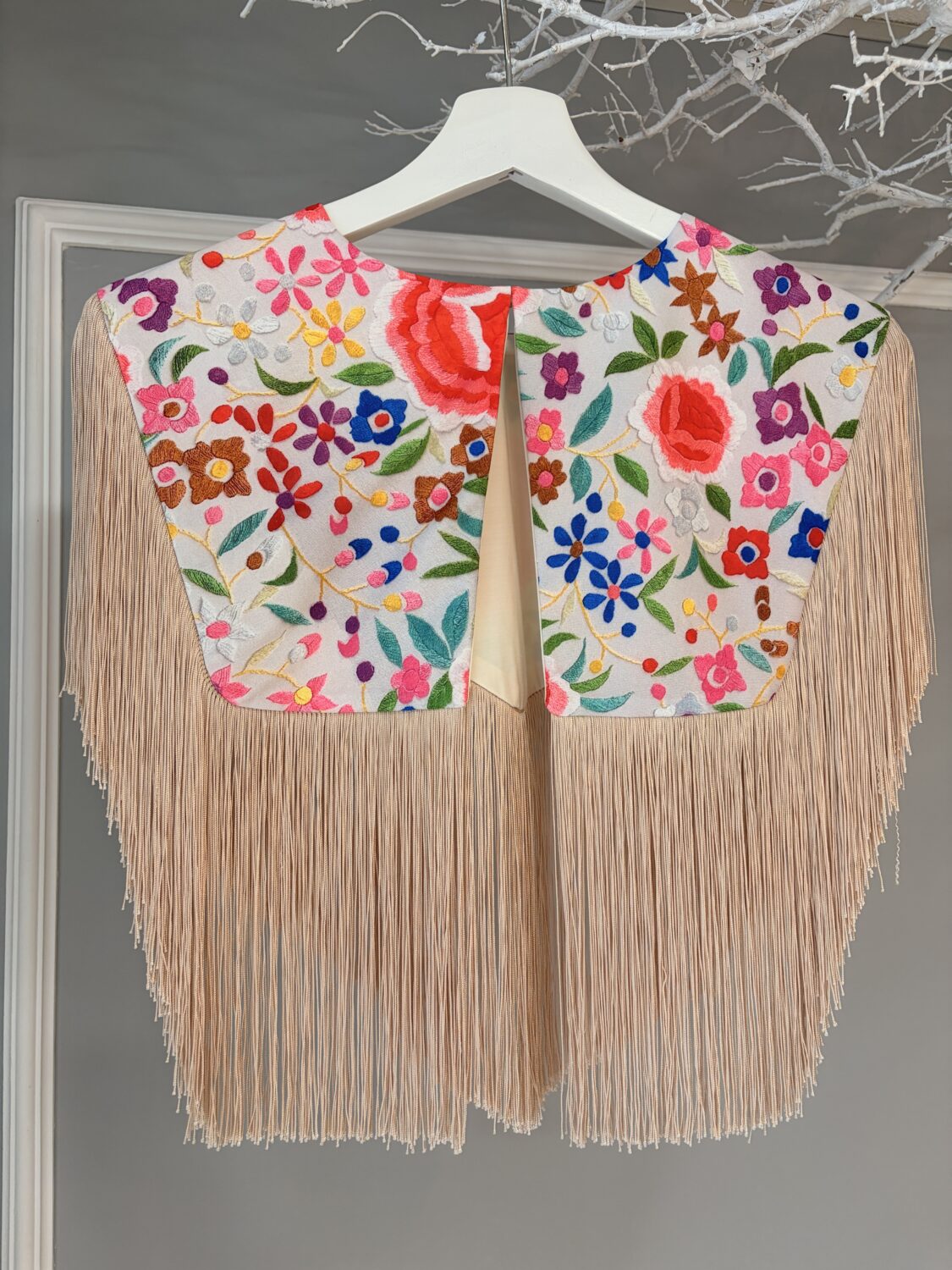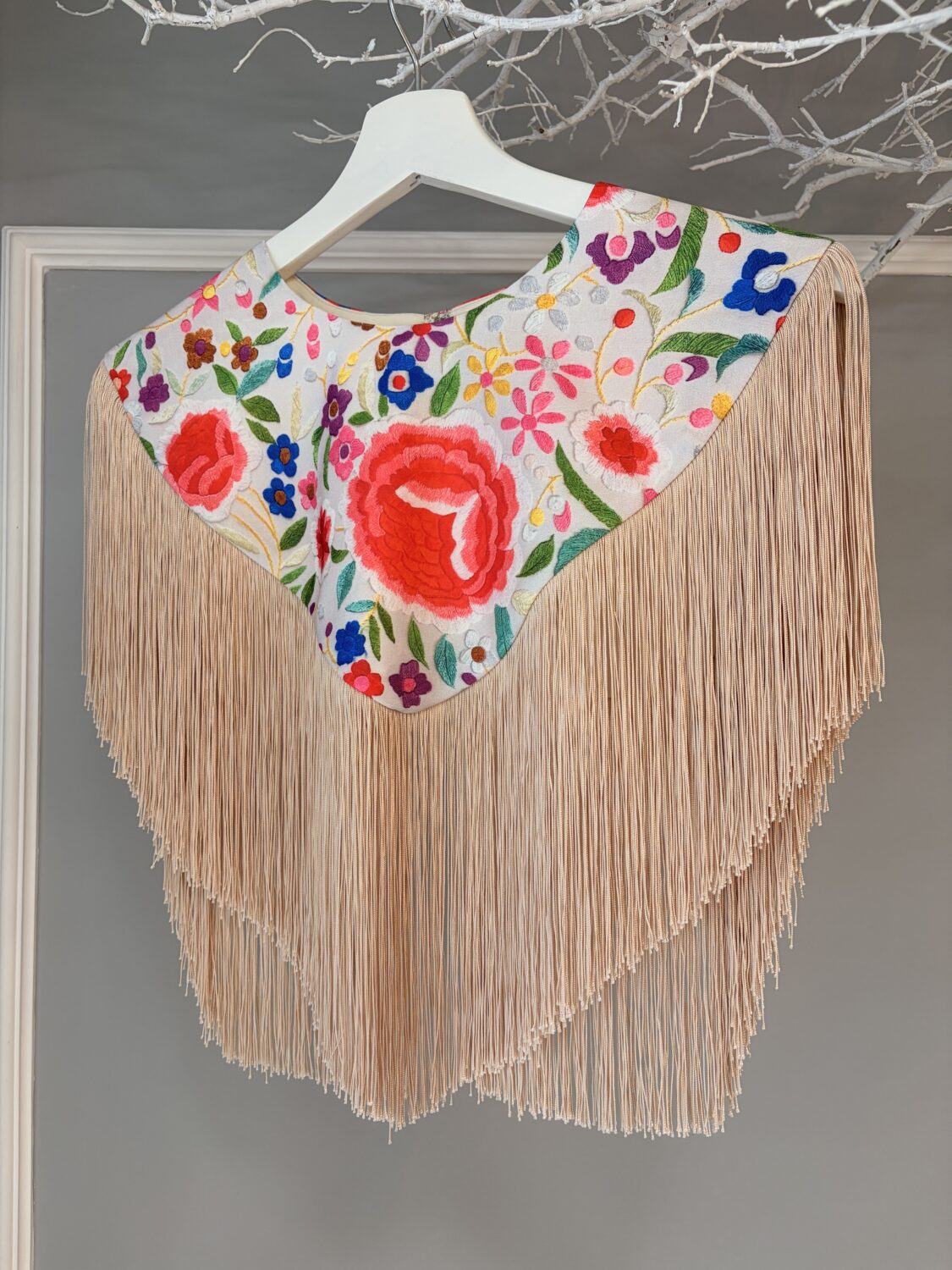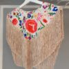 Capa pico estampada mantón colores fondo beige.