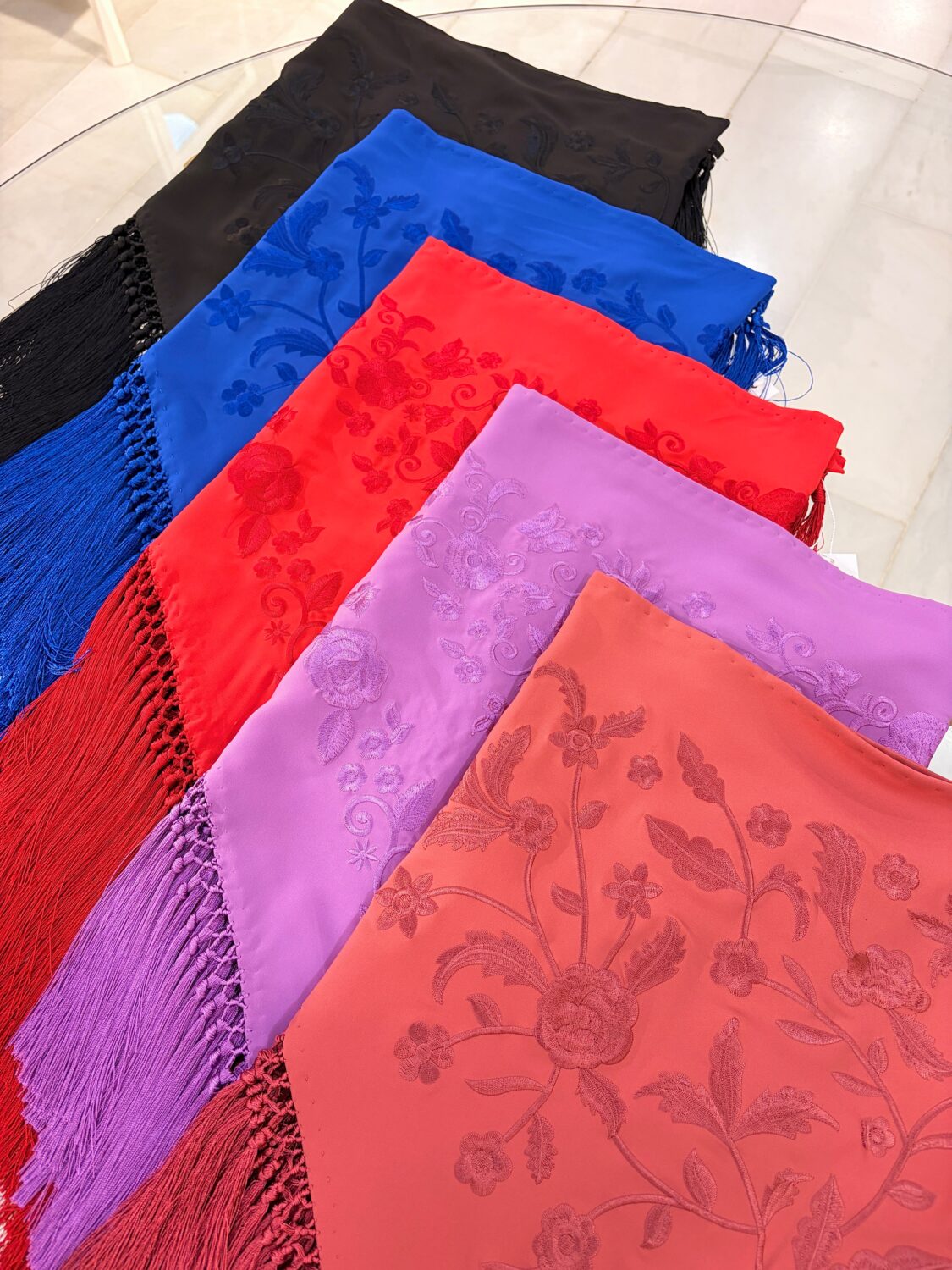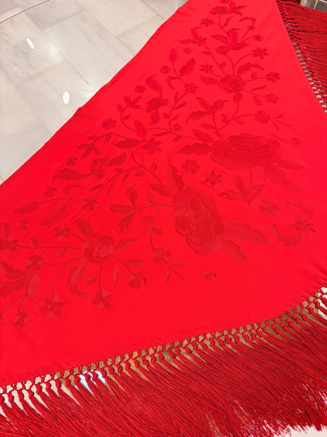 Mantoncillo bordado a tono, flecado a borlones